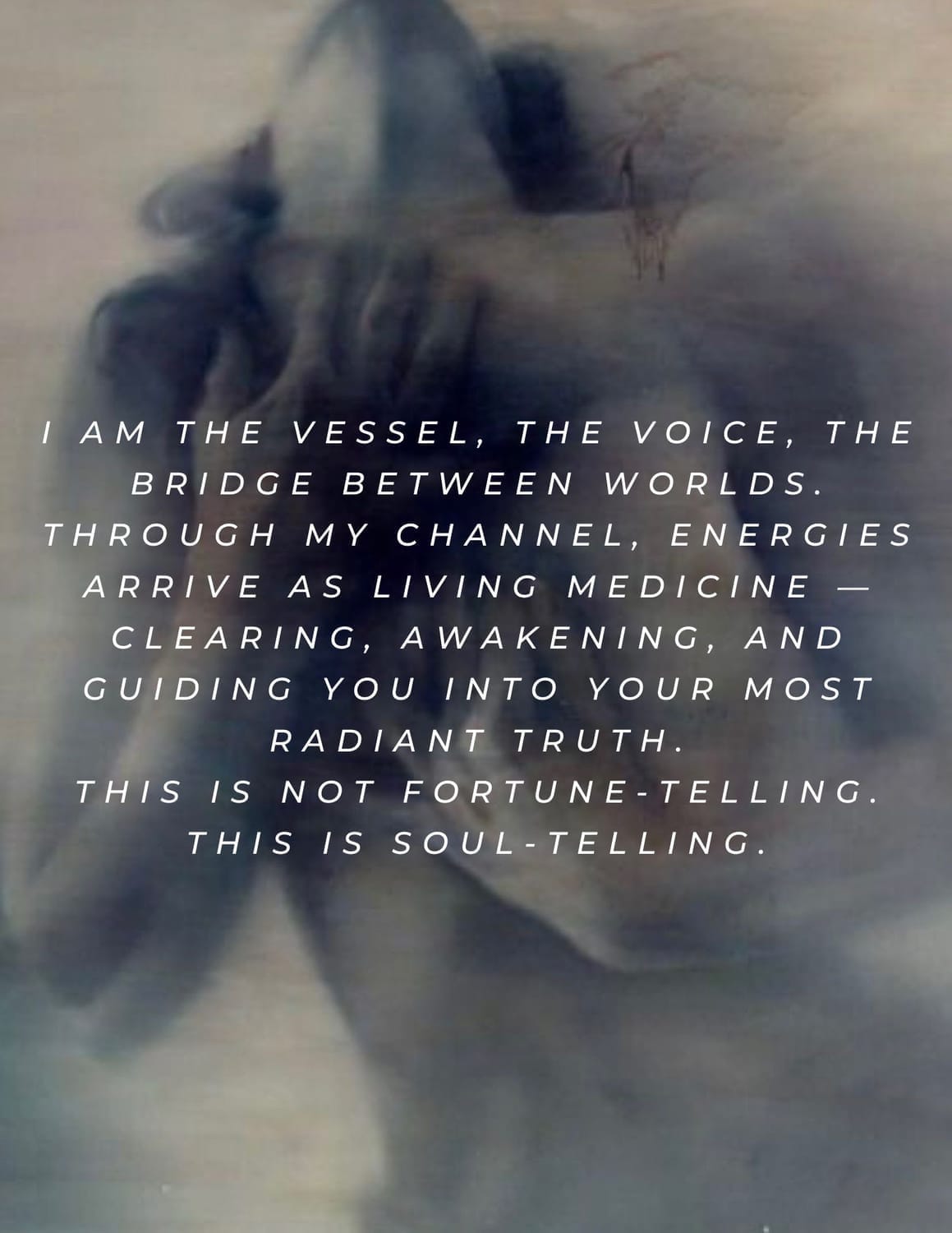 Through my channel, energies arrive as medicine: sometimes as the soft balm of love, sometimes as the fierce flame that ignites transformation. I see beyond words into the truth of your being, allowing the currents of divine intelligence to reveal what is ready to be healed, released, or claimed.